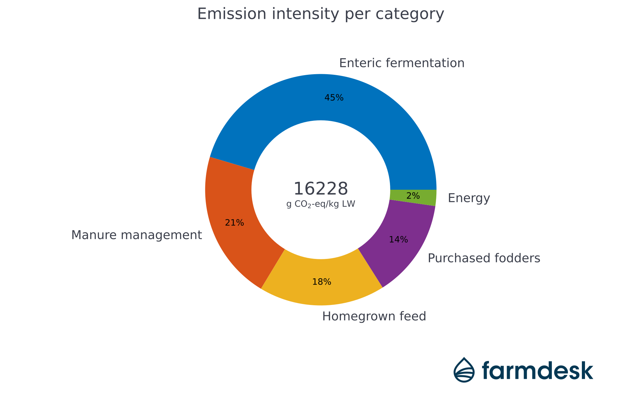 The case farm had total emissions of 16.2 kg CO2-eq per kg of live weight leaving the company in 2024. Enteric fermentation accounted for 7.4 kg CO2-eq/kg LW (45%), followed by manure management with 3.4 kg CO2-eq/kg LW (21%), homegrown feed with 2.9 kg CO2-eq/kg LW (18%), purchased feed with 2.2 kg CO2-eq/kg LW (14%) and energy consumption with 0.3 kg CO2-eq/kg LW (2%).