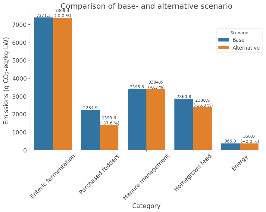 Halving the proportion of soybean meal and replacing it with rapeseed meal results in a 38% reduction in the category of purchased feed. In addition, the category of own-grown feed decreases by 17% due to reduced fertilizer use on grassland and the introduction of mixed cultivation of triticale with field beans.